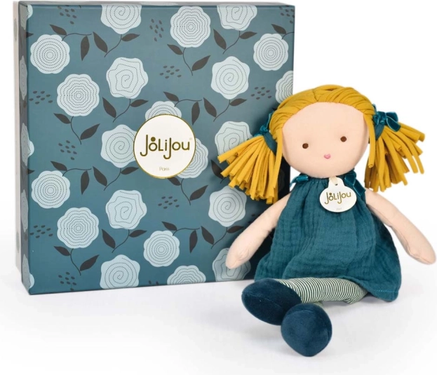 La poupée Jade de Doudou Jolijou est une compagne toute en douceur pour les bébés comme pour les enfants d’âge préscolaire. Son look bohème est souligné par des collants rayés, une robe turquoise et des cheveux blonds façon « spaghetti » attachés en couettes. Grâce à sa conception textile moelleuse, elle est parfaite pour les câlins et entièrement sûre.