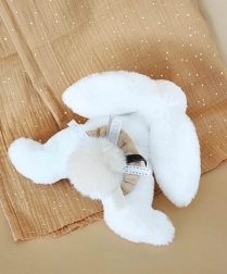 Le détail stylé du pompon beige et du foulard autour du cou souligne l’allure moderne du jouet. Le lapin est présenté dans une élégante boîte cadeau – idéale pour une naissance, un baptême ou comme attention délicate pour toute occasion.