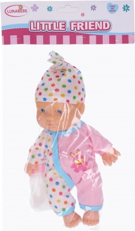 Découvrez le bébé avec accessoires de 26 cm, idéal pour le jeu et le développement des compétences sociales. Disponible en variantes rose et violette.