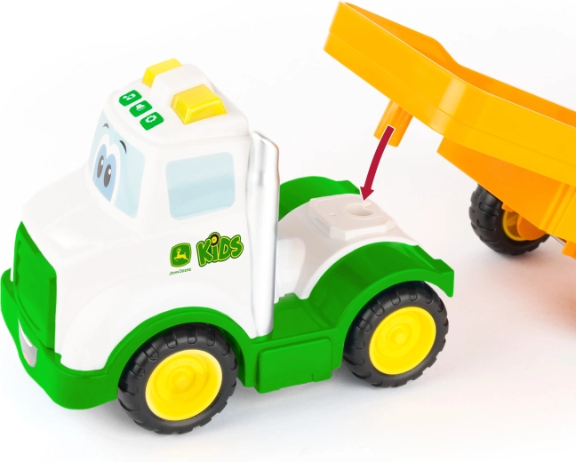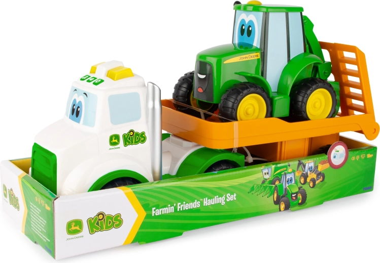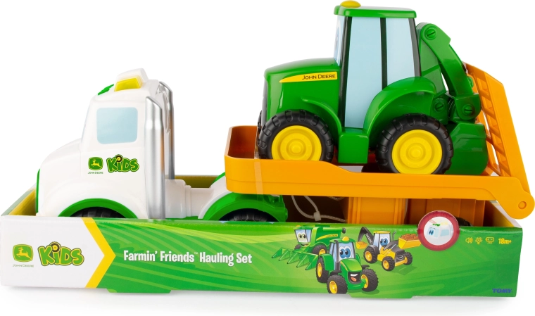 Ce set de jeu combine une semi-remorque avec rampe et le sympathique tracteur Johnny dans les couleurs classiques JOHN DEERE. Les enfants développent leur motricité fine en chargeant et déchargeant, tout en stimulant leur imagination avec des scénarios de ferme. Avec sa longueur de 37 cm, l’ensemble est stable et facile à prendre en main.