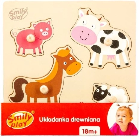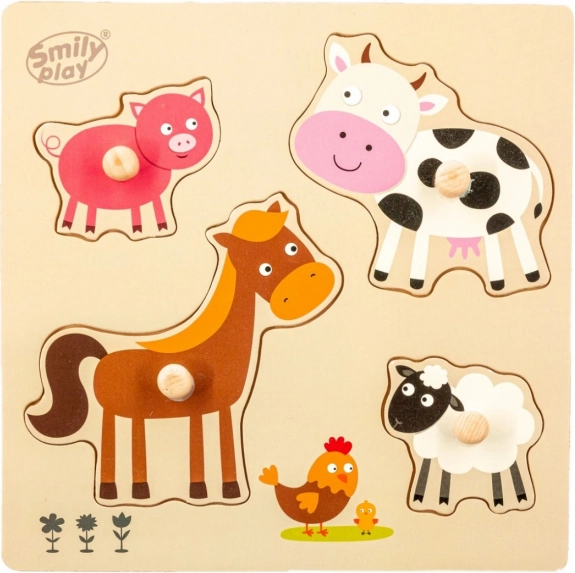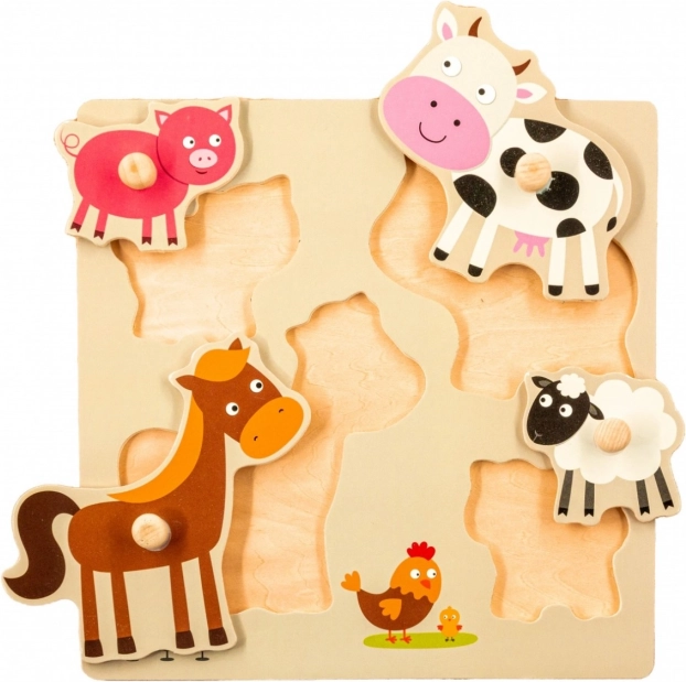 Puzzle en bois avec des emplacements spécialement façonnés sur la planche, offrant quatre formes et couleurs différentes représentant des animaux domestiques. Chaque pièce possède une poignée qui facilite l’assemblage pour l’enfant.