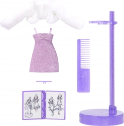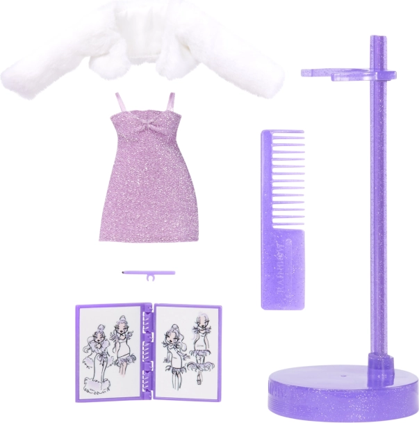 La poupée séduit par ses cheveux abondants et ondulés parfaits pour le brossage, sa robe scintillante, son blouson blanc effet « fourrure » tout doux et ses petites chaussures violettes à talons. La boîte inclut également un peigne, un support et un petit cahier illustré pour inspirer histoires et créations de mode.