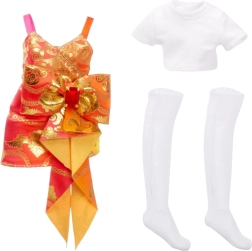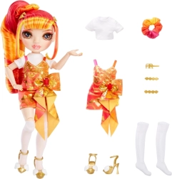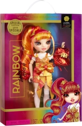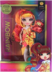 Laurel brille dans une combinaison orange‑doré avec des détails marquants qui soulignent le caractère mode de la série RAINBOW HIGH.