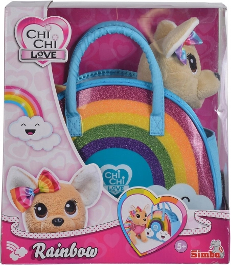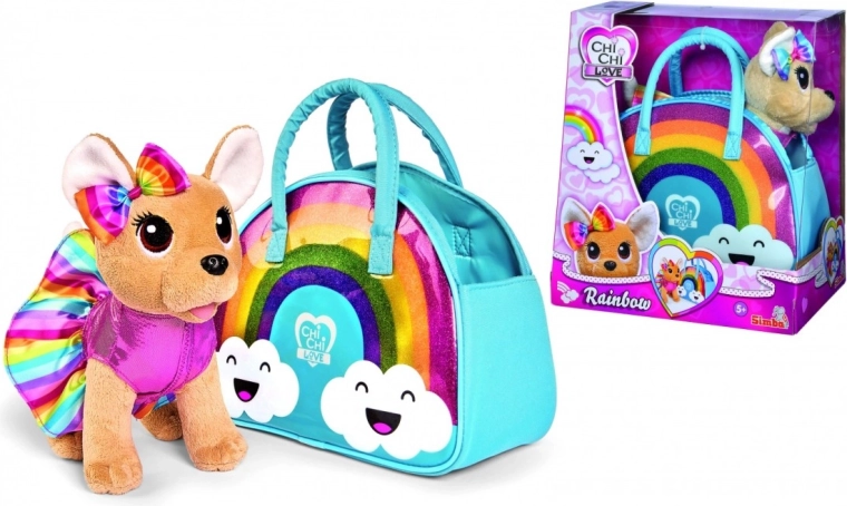Un chiot chihuahua en peluche, vêtu d’une adorable tenue arc-en-ciel avec un nœud assorti, séduit par son imprimé arc-en-ciel coloré et scintillant.