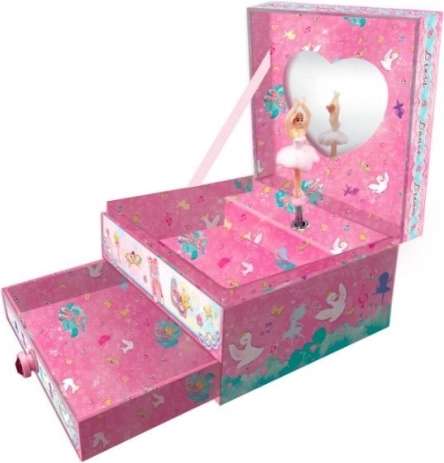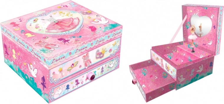 Élégante boîte à bijoux musicale avec figurine tournante et mélodie classique, qui ravira petites et grandes amatrices de trésors. À l’ouverture, la figurine se met à bouger; à l’intérieur, vous trouverez un miroir, un espace pour les petits objets et un tiroir coulissant. La boîte fonctionne grâce à un remontage mécanique sans piles.