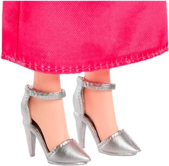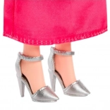 Une robe élégante et un gilet noir donnent à la poupée une allure de fête, tandis que les chaussures argentées complètent le style.