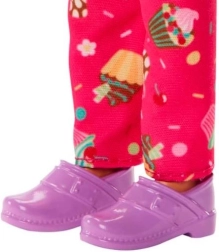La poupée Barbie est vêtue d'une veste de chef blanche avec des détails roses et une toque, ce qui l'aide dans son rôle de pâtissière.