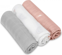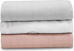 Trois langes assortis en couleurs, au format 70 × 70 cm, serviront pour l’emmaillotage, l’allaitement, les repas et comme sous-couche pour le change – à la maison comme en déplacement.