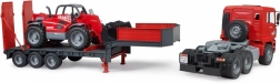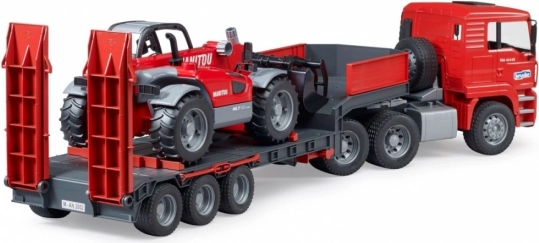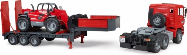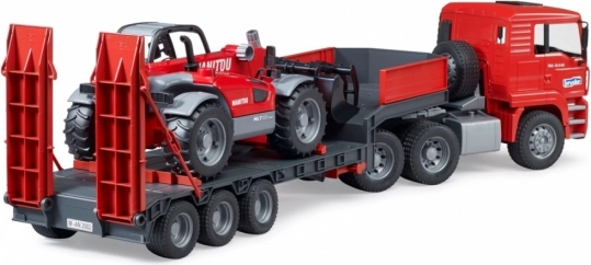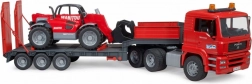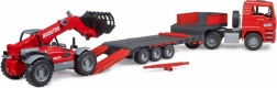 Ce set robuste combine un modèle réaliste de camion MAN TGA avec remorque porte-engins et un chargeur télescopique MANITOU MT633 détaillé. Les enfants apprécieront les éléments fonctionnels tels que les rétroviseurs rabattables, le capot moteur ouvrant, le pare-brise résistant, les rampes mobiles et les béquilles de la remorque. Le chargeur dispose d’un bras extensible réglable en hauteur et d’une benne amovible – prêt pour tous les défis de chantier.