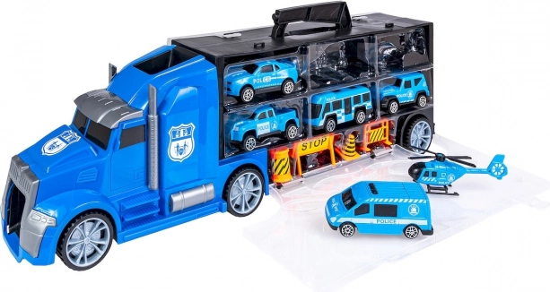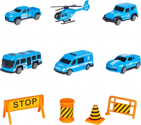 L’ensemble comprend différents types de véhicules et d’accessoires pour une expérience de jeu complète, y compris un hélicoptère et une signalisation routière.