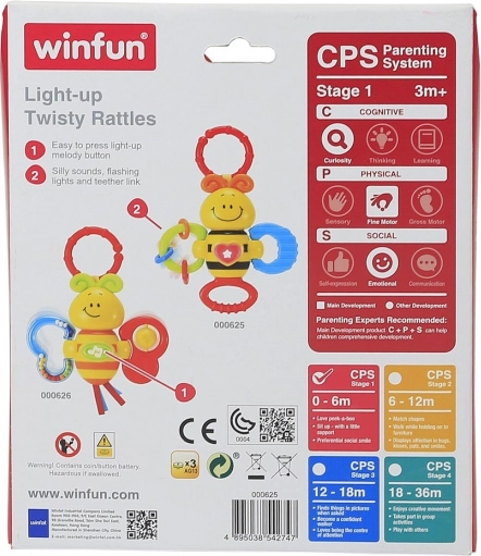 Cette abeille colorée est un premier jouet idéal pour les tout-petits. En la secouant, elle produit un agréable bruit de hochet, et en appuyant sur le bouton central, des mélodies et une petite lumière clignotante s’activent, stimulant la curiosité et la perception sensorielle. Sa forme ergonomique et ses multiples anneaux de préhension facilitent la tenue par les petites mains.