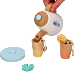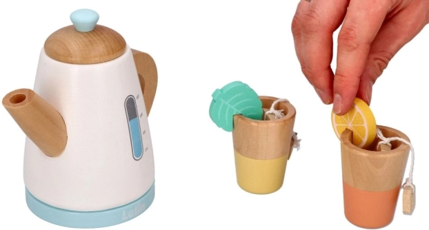 Engagez-vous dans le jeu du goûter avec le service à thé en bois, comprenant une théière, des tasses et des accessoires comme des tranches de citron et des sachets de thé.