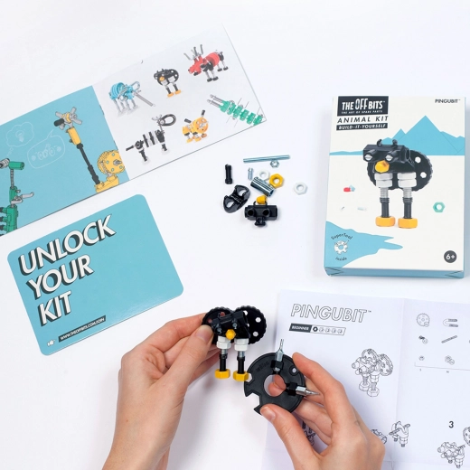 Découvrez le kit créatif OffBits PingouinBit pour les enfants dès 6 ans, qui développe la créativité, la motricité fine, la pensée logique et soutient les domaines STEAM. Avec des vis colorées, des écrous et des pièces moulées, vous construirez le PingouinBit et une infinité de créations originales selon vos idées.