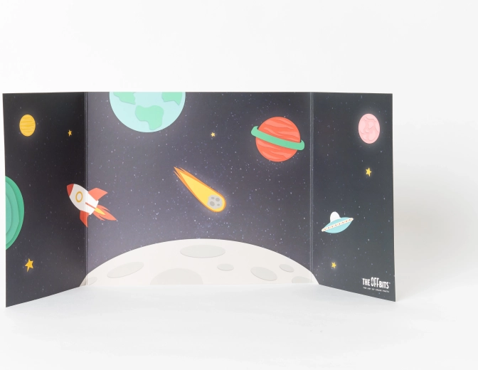 Un décor en carton pliable à thème cosmique crée un environnement saisissant pour jouer et photographier les modèles terminés. La construction stable en trois panneaux élargit l’univers de jeu.