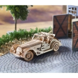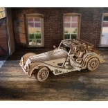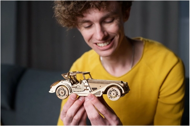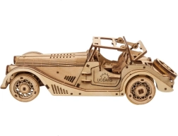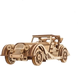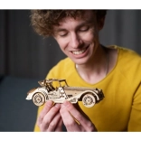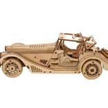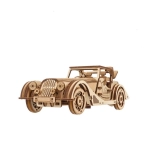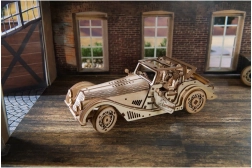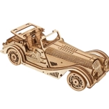 Le modèle se distingue par un intérieur détaillé, des portes latérales ouvrantes, un toit rigide manipulé à la main avec toit ouvrant et une roue de secours fonctionnelle dans le coffre. Tout le nécessaire est inclus – les pièces sont prédécoupées et l’assemblage se fait à l’aide d’un manuel illustré en 11 langues. Conservez le bois naturel ou peignez votre voiture selon vos envies.