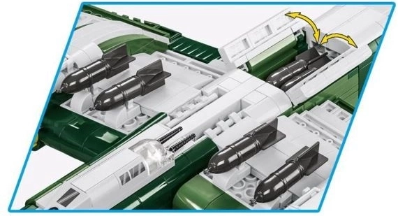 Le set comprend 1160 pièces avec des impressions résistantes (aucun autocollant), des éléments nouvellement conçus pour une cabine réaliste, des soutes à bombes ouvrantes, des bombes amovibles et un train d’atterrissage fonctionnel. Le cockpit peut accueillir une figurine de pilote (incluse). Un manuel intuitif avec pictogrammes garantit un montage fluide.
