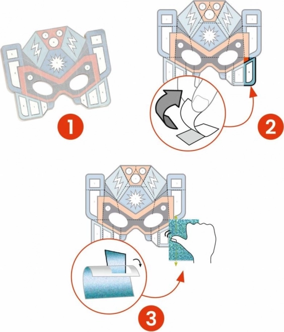 Ce kit créatif permet aux enfants de personnaliser facilement et avec plaisir 4 masques de super robots. Grâce aux zones adhésives numérotées, il suffit d’ôter le papier protecteur et d’appliquer les feuilles métalliques – le matériau adhère comme par magie et les masques brillent de mille feux.