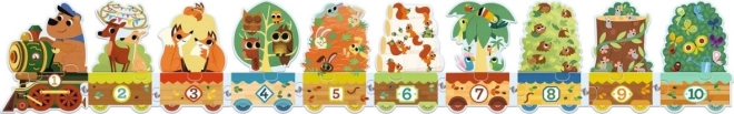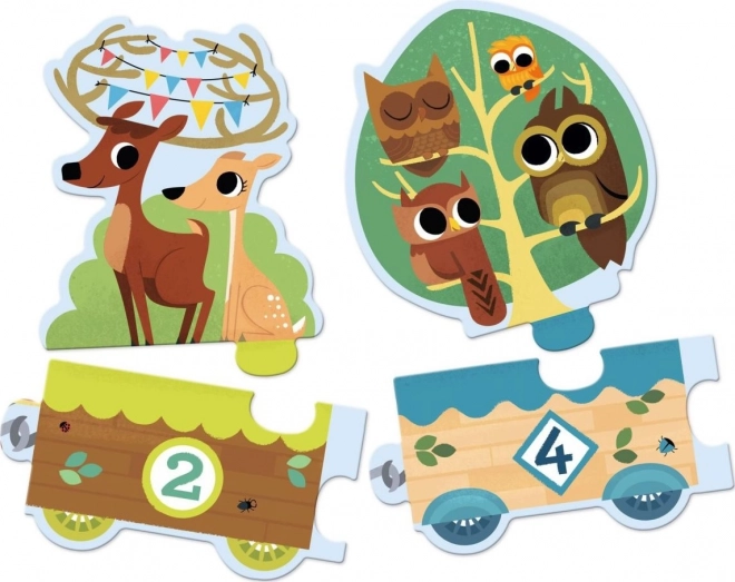 - Apprentissage ludique des chiffres : wagons numérotés de 1 à 9 et nombres d’animaux correspondants.