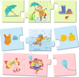 Puzzle Trio Ma journée de la marque DJECO est idéal pour un premier puzzle. Les enfants associent des trios d’images qui vont ensemble thématiquement, tout en rejouant les activités quotidiennes. Du réveil matinal au coucher du soir, chaque trio forme un petit récit simple.