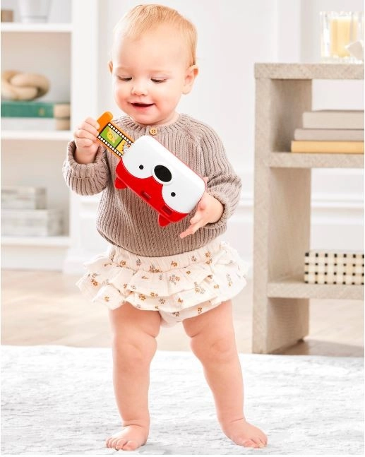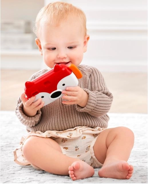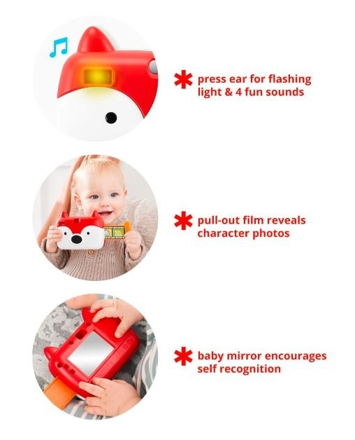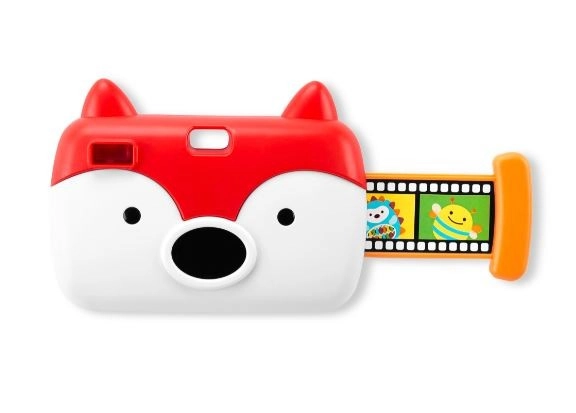 Un appareil photo pour enfants en forme de renard de la marque Skip Hop ravira les petits photographes dès 6 mois. Il propose des sons d’obturateur réalistes, un « flash » clignotant, un miroir pour enfants pour la découverte de soi et une bande « film » coulissante avec de jolies illustrations. Il tient facilement dans les petites mains et, d’une simple pression sur l’oreille du renard, déclenche lumières et sons.