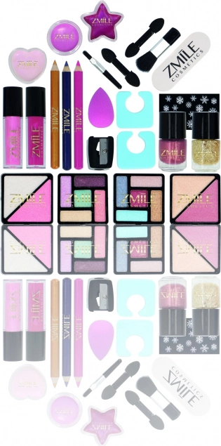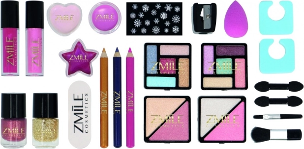 • 24 surprises : fards à paupières, vernis à ongles, crayons yeux et lèvres, gloss, rouges à lèvres, applicateurs, miroir.