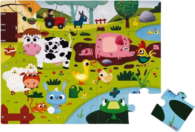 Puzzle pour enfants JANOD avec des animaux de la ferme. Certaines pièces ont une finition de surface spéciale — une texture caractéristique des vrais animaux. Les puzzles développent la logique, l’attention et la mémoire des enfants. Grâce aux puzzles, ils apprennent à reconnaître les couleurs, les formes et les objets, développent la motricité des mains et comprennent la relation entre les parties et le tout. Grâce aux éléments spéciaux du puzzle, les enfants apprennent à percevoir différentes textures par le toucher. Dimensions du puzzle assemblé : env. 65 × 50 cm