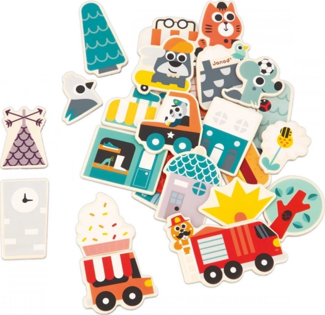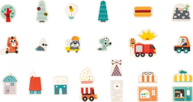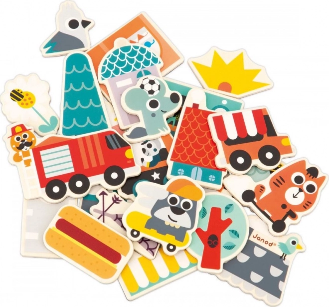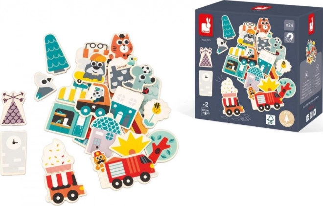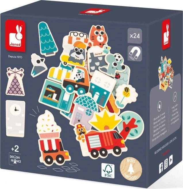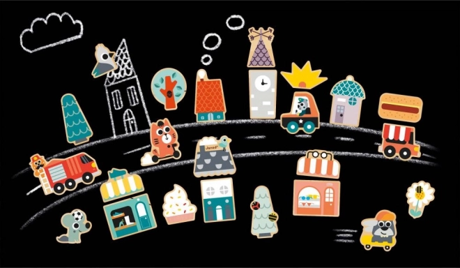 Avec cet ensemble de 24 aimants en bois, vous pouvez construire sur toutes les surfaces magnétiques ! Le set d’aimants pour enfants comprend, en plus d’une trottinette et d’un skateboard, des aimants de véhicules (camion de pompiers, voiture de police, camion de restauration) ainsi que des éléments nécessaires pour assembler des boutiques, des maisons et faire prospérer cette ville habitée par de joyeux animaux. Les aimants peuvent être mélangés pour créer de nombreuses combinaisons différentes.