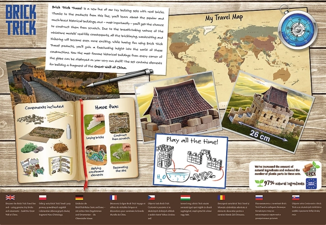 Découvrez la beauté et l’histoire de l’un des monuments les plus célèbres au monde. Avec la gamme Brick Trick Travel, vous construirez la Grande Muraille de Chine depuis les fondations et créerez pas à pas un modèle impressionnant à partir de véritables briques d’argile et d’éléments en bois. Grâce aux décorations et autocollants inclus, vous obtiendrez un aspect authentique.