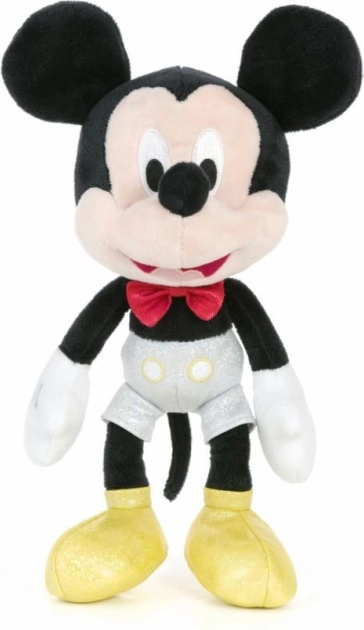 Peluche mascotte Mickey avec short et chaussures brillants et nœud papillon rouge. Hauteur : 25 cm, dès 0 mois