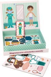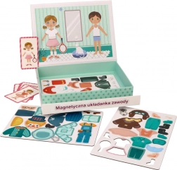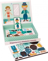 Ce puzzle magnétique en valisette fait découvrir aux enfants l’univers de différents métiers sous la forme d’un jeu d’« habillage ». Les enfants assemblent les personnages et leurs uniformes sur la planche magnétique, s’inspirent des cartes ou créent leurs propres combinaisons. Le jeu encourage naturellement l’imagination, la patience et l’apprentissage par le jeu.