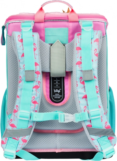 Entrez dans le monde merveilleux du flamant rose avec ce cartable scolaire. Le cartable est conçu pour les enfants à partir de la 1ère classe et offre un confort maximal grâce à son dos ergonomiquement formé et ses bretelles entièrement réglables. Le système de dorsale spécial ERGO ADJUSTABLE SYSTEM permet un réglage facile de la hauteur des bretelles, assurant un ajustement parfait du cartable.