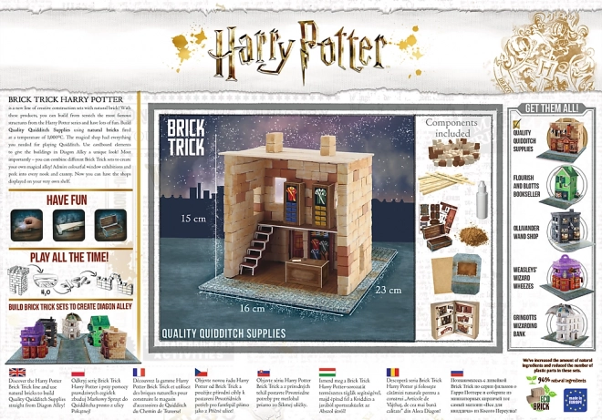 La construction permet d’ériger un modèle détaillé d’un magasin d’équipement de Quidditch, tel que vous le connaissez du Chemin de Traverse.