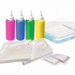 - Le kit comprend 3 flacons de gel coloré de 30 ml, un bol, 2 moules et 2 sachets pour mélanger avec de l’eau.