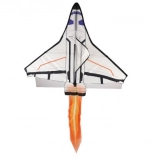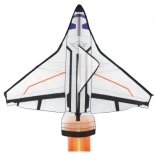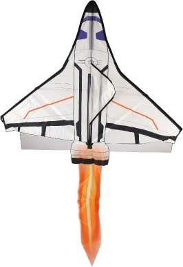 Ce cerf-volant est conçu en forme de navette spatiale avec une combinaison de blanc, de noir et d’orange, imitant l’apparence d’une véritable navette.