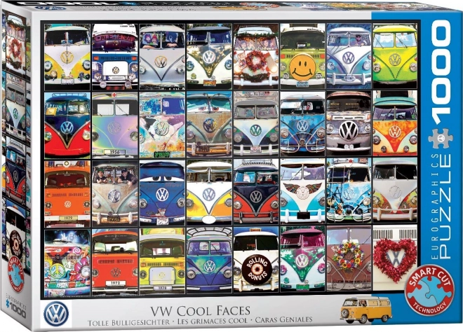 Le puzzle EUROGRAPHICS VW Cool Faces est emballé dans une boîte carrée compacte, qui économise de l’espace et est idéale pour le stockage comme pour le transport. Ce qui distingue ce puzzle, c’est sa découpe originale. Les pièces n’ont pas une forme standard, ce qui augmente la difficulté globale et propose une expérience de jeu inédite.