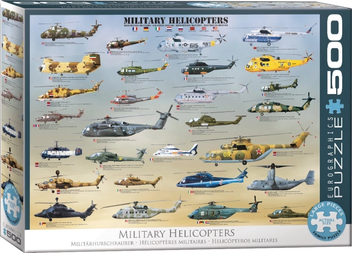 Ce puzzle ravira à coup sûr tout passionné d’aviation ! Il présente plus de 25 des hélicoptères militaires les plus populaires de l’histoire, dont l’Eurocopter Tiger, le Comanche et le Chinook.