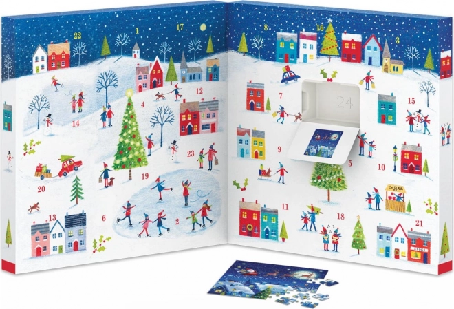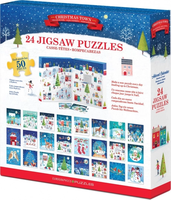 Le calendrier de l’Avent EUROGRAPHICS propose chaque jour un mini puzzle sur le thème de Noël. L’emballage contient 24 puzzles séparés, chacun de 50 pièces, qui deviennent une image carrée de 12,5 × 12,5 cm une fois assemblés. Dans chaque fenêtre se trouve également un modèle imprimé, rendant l’assemblage agréable pour les enfants comme pour les adultes.