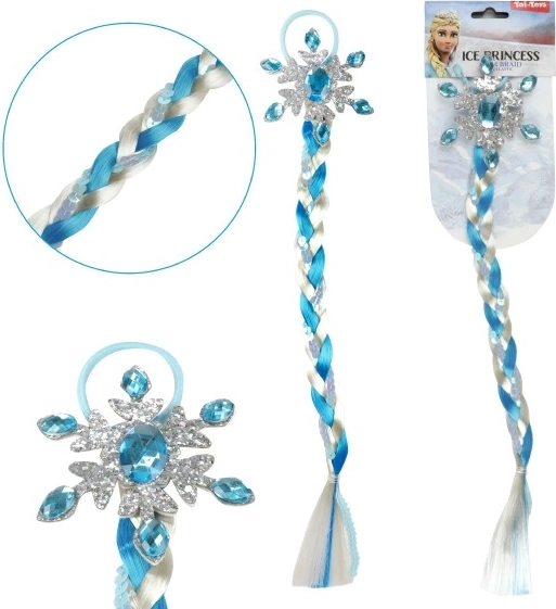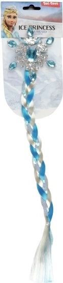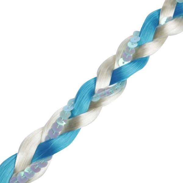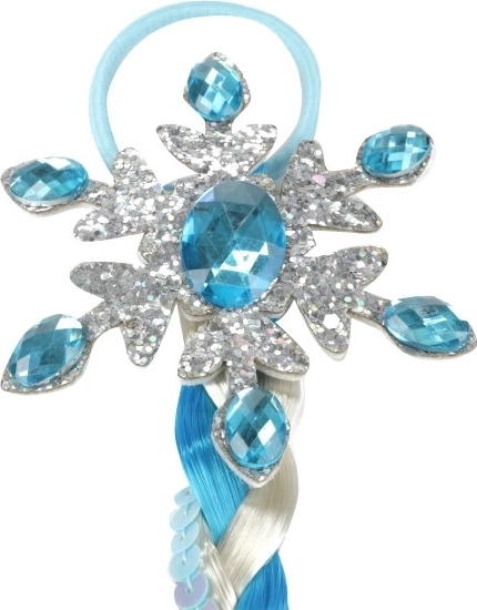La tresse de princesse de glace est faite de mèches bleu-blanc, ornées de flocons et de paillettes thématiques. Elle est facilement fixable grâce à un élastique, garantissant un port confortable.