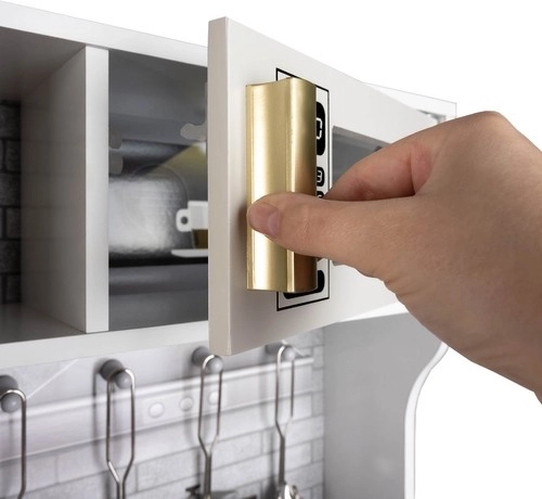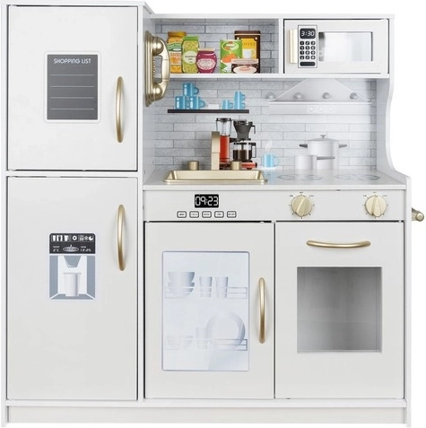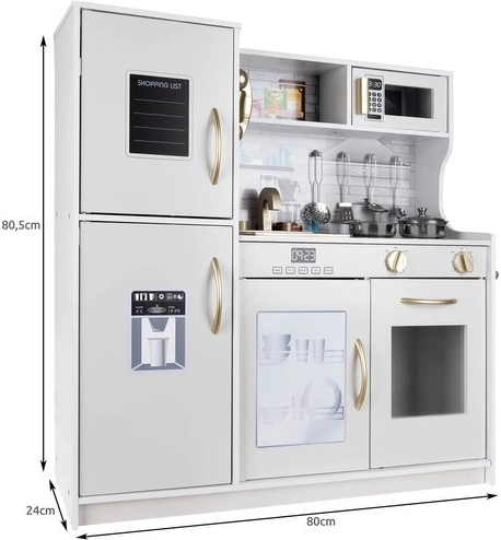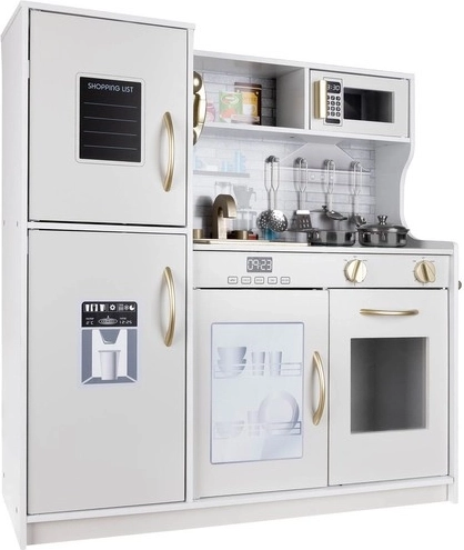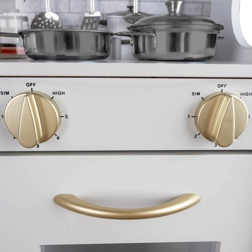 Cette cuisine XL en bois est conçue pour des heures de jeu. L’éclairage LED intégré peut être placé sous un meuble, dans un placard ou dans le four, et les interrupteurs rotatifs à clic renforcent l’impression de cuisiner réellement. Sa structure robuste en MDF et son élégante finition blanc-or embelliront la chambre des enfants.