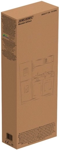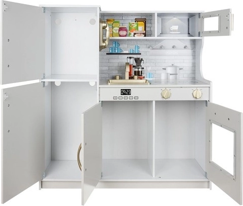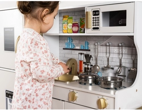 La cuisine XL en bois élégante de la marque KRUZZEL en blanc avec des détails dorés offre un jeu réaliste grâce à un éclairage LED, aux sons des brûleurs et à un riche ensemble d’accessoires. Sa structure en bois robuste, ses portes à fermeture « clic », un évier amovible et des appareils comme le four et le micro-ondes stimulent le jeu créatif et le développement de la motricité fine.