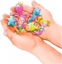 Set créatif complet avec des moules de sirènes et de créatures marines. Déposez le gel dans le moule, plongez-le dans l’eau et observez la transformation magique en figurine 3D souple.