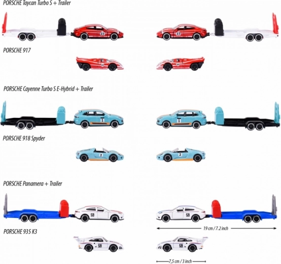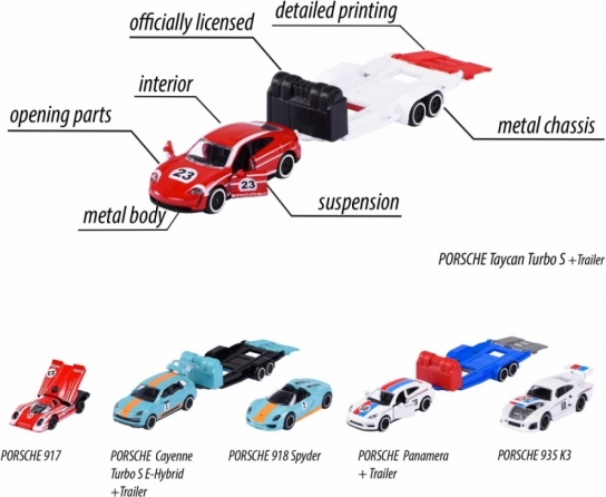 Chaque set propose un duo unique de voiture de course et véhicule tracteur avec remorque. Combinaisons possibles : Cayenne Turbo S E‑Hybrid + 918 Spyder ; Panamera + 935 K3 ; Taycan Turbo S + 917.
