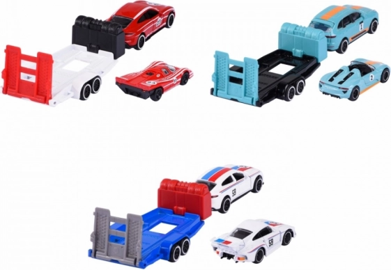 Découvrez les modèles emblématiques PORSCHE de la marque française Majorette, qui fabrique depuis 1964 des voitures métalliques réalistes et robustes. Ce set offre des expériences de transport avec une voiture de course sur remorque et un véhicule tracteur – idéal pour recréer des scènes de motorsport et stimuler l’imagination.
