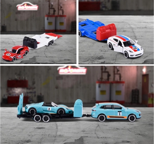 Chaque set comprend 2 voitures PORSCHE sous licence et une remorque aux couleurs assorties. Grâce à l’échelle 1:64, elles tiennent facilement dans la poche et séduisent par leur niveau de détail, y compris des parties ouvrantes. Parfait pour les enfants dès 3 ans et les collectionneurs passionnés.