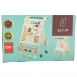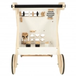 Chariot en bois pour tout-petits avec des éléments interactifs en tant que forme de jeu et d'apprentissage. Favorise le développement de la motricité et la coordination main-œil, en combinant amusement et apprentissage.
