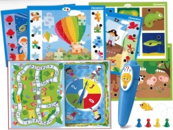 Le jeu contient un stylo interactif qui reconnaît les bonnes réponses et fournit un feedback par clignotement et quatre messages vocaux. L'ensemble comprend un jeu de plateau Quiz en ville, 60 cartes avec diverses activités, un autocollant, une flèche et des figurines.