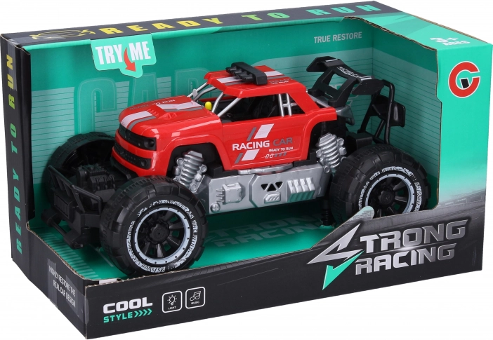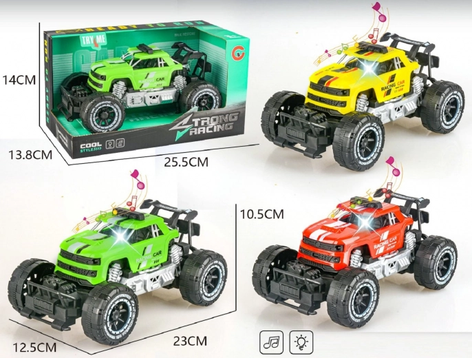 Voiture tout-terrain à friction avec effets lumineux et sonores. Dimensions 23 × 12,5 × 10,5 cm, piles 3× AG13 incluses. Trois couleurs : vert, jaune, rouge.
