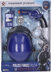 - Pistolet 20 cm (effets sonores acoustiques), insigne de police, talkie-walkie, menottes avec clé, casque