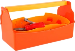 Boîte orange en plastique avec une poignée jaune solide et un compartiment interne, qui garde tous les outils bien organisés au même endroit, et que les enfants peuvent transporter facilement.