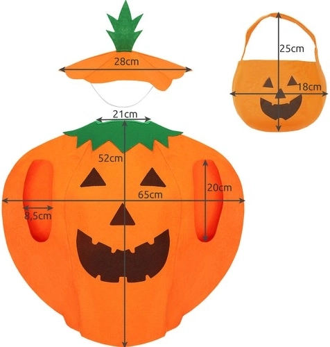 Nous vous présentons le parfait costume de citrouille pour enfant pour Halloween. Ce set est universel grâce à ses dimensions et convient aussi bien aux enfants plus jeunes qu'aux plus âgés. Il est idéal pour les occasions festives et assure le confort de chaque enfant.
